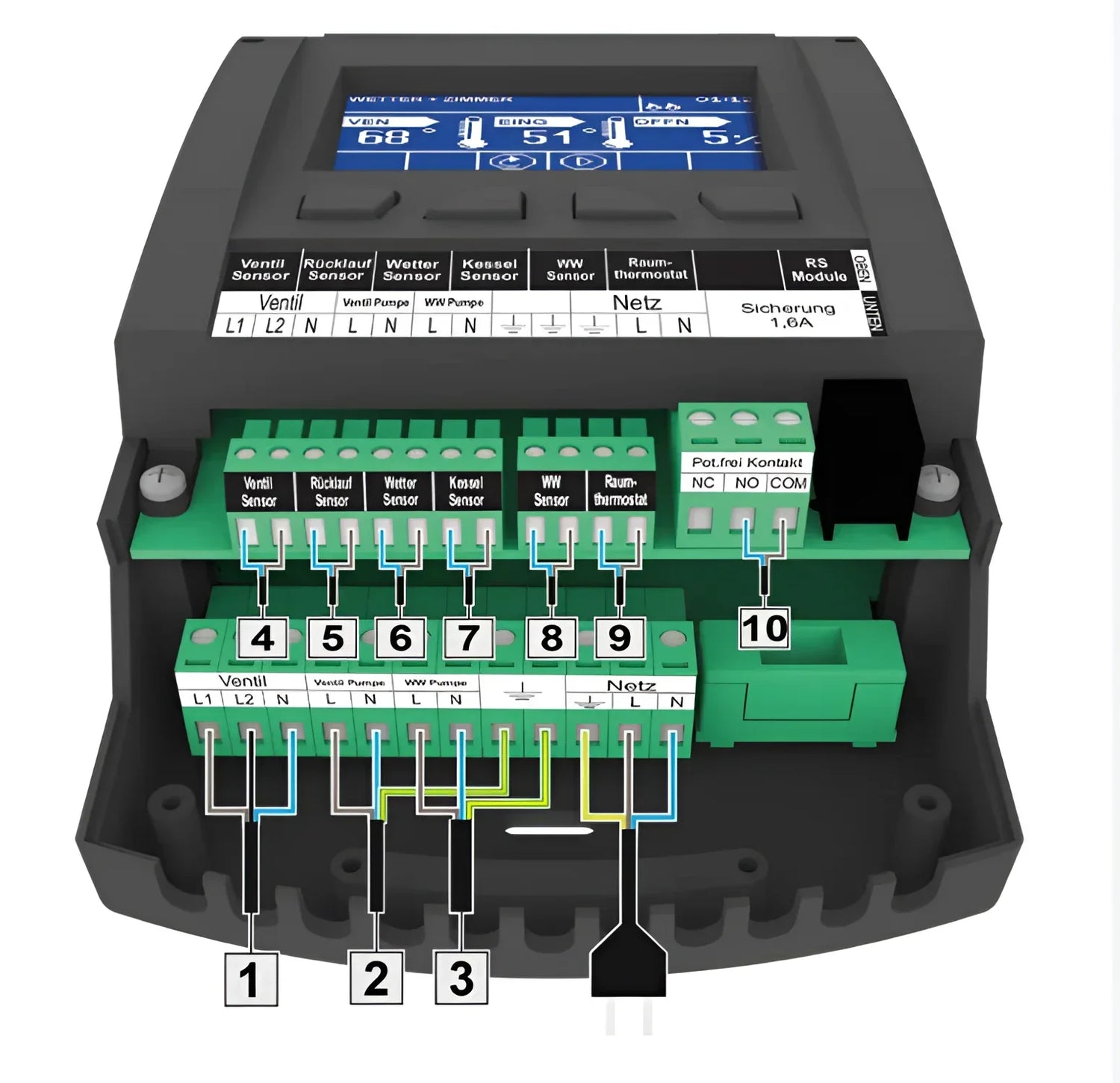 Regulatorul circuitului de încălzire oferă, de asemenea, o ieșire fără potențial pentru controlul dispozitivelor externe, cum ar fi cazanele sau pompele de căldură. Opțiunile de control extensibile - de exemplu, prin intermediul unui termostat de cameră opțional - permit personalizarea și mai eficientă a regulatorului în funcție de cerințele sistemului dumneavoastră de încălzire. O extensie wireless este, de asemenea, disponibilă ca opțiune.