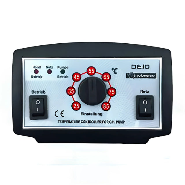 Řídicí jednotka čerpadla Master DE.10 umožňuje přesné ovládání oběhového čerpadla nebo přehřívače zpětného toku kotle. Teplotu lze snadno nastavit pomocí praktického otočného ovladače. Řídicí jednotka zapne čerpadlo, jakmile je dosaženo nastavené teploty, a automaticky jej vypne, pokud teplota kotle klesne o více než 2 °C pod cílovou hodnotu. Tato přesná funkce zajišťuje, že čerpadlo pracuje pouze tehdy, když je skutečně potřeba. To zajišťuje energeticky úsporný provoz a prodlužuje životnost čerpadla.