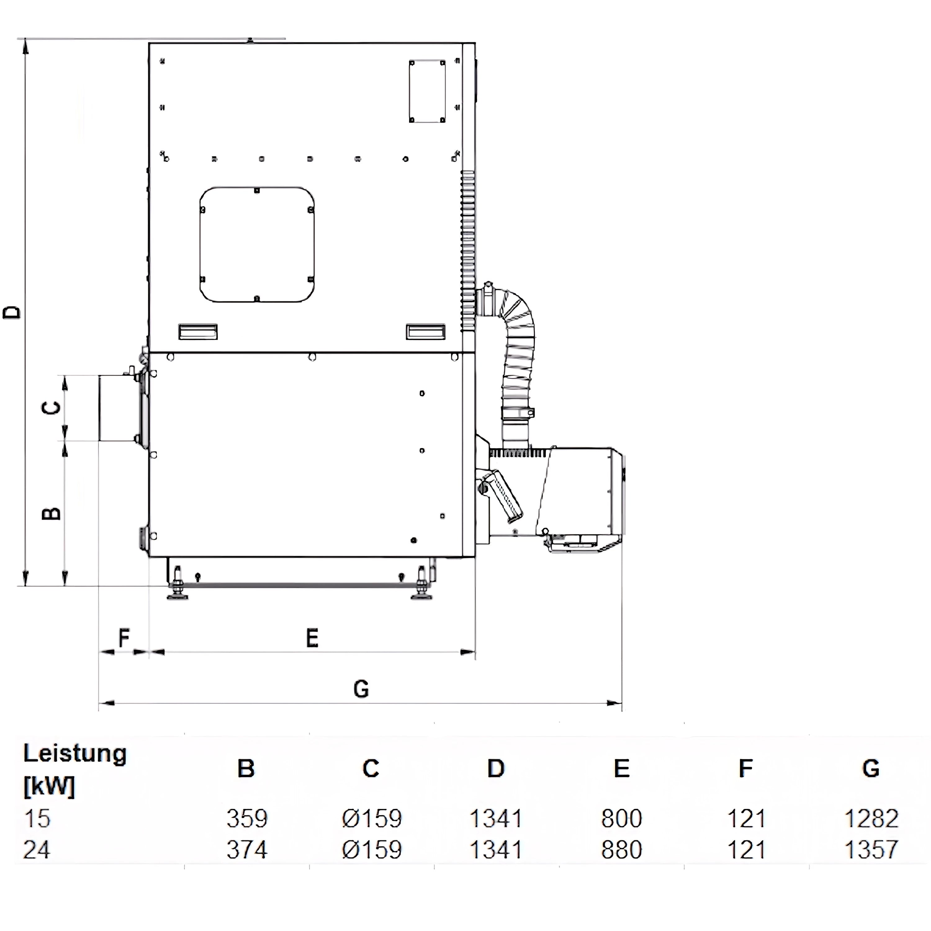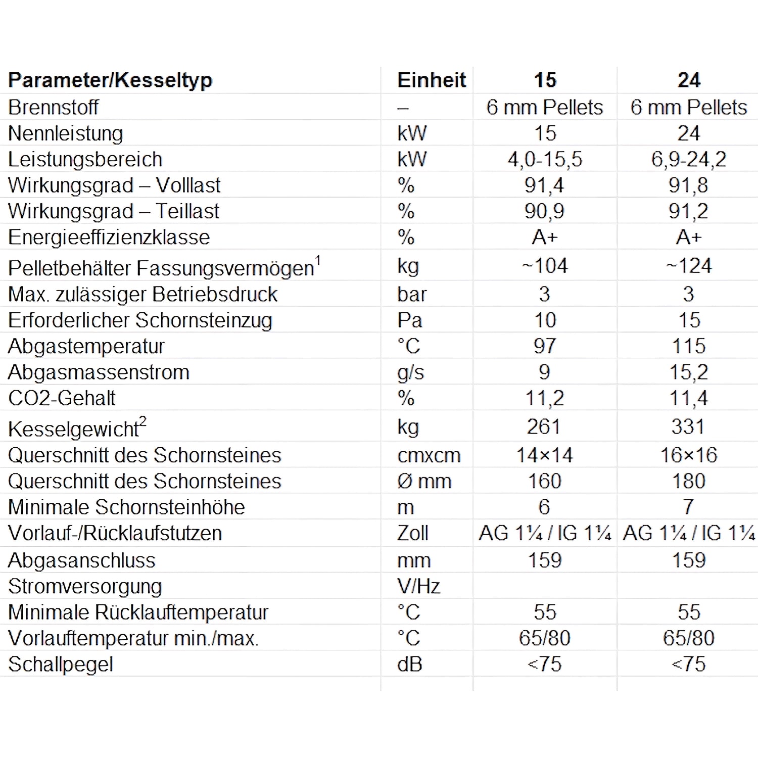Verfügbare Nennleistungen sind unter anderem 15 kW und 24 kW; die Baureihe deckt insgesamt ein breites Leistungsspektrum von ca. 11 bis 30 kW ab. Das Gerät erfüllt die Emissionsklasse 5 sowie die Anforderungen des Ekodesign-Standards und ist in der Energieeffizienzklasse A+ eingestuft.