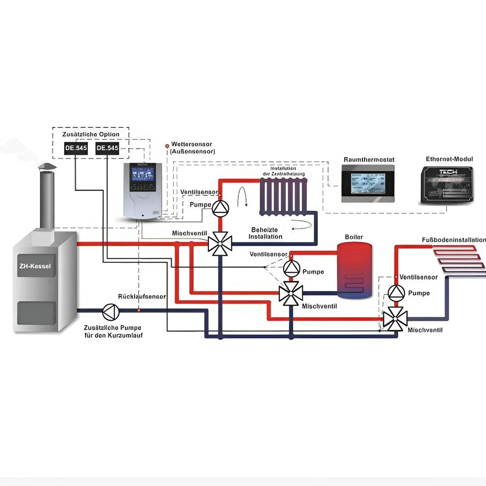 Der Regler steuert Drei- oder Vierwege-Mischventile inklusive Ventilpumpe und Warmwasserpumpe. Mehrere Temperatursensoren (Kessel, Ventil, Rücklauf, Außen, Warmwasser) ermöglichen eine präzise Überwachung der Anlage. Ein übersichtliches LCD-Display und eine klare Menüstruktur erleichtern die Bedienung.