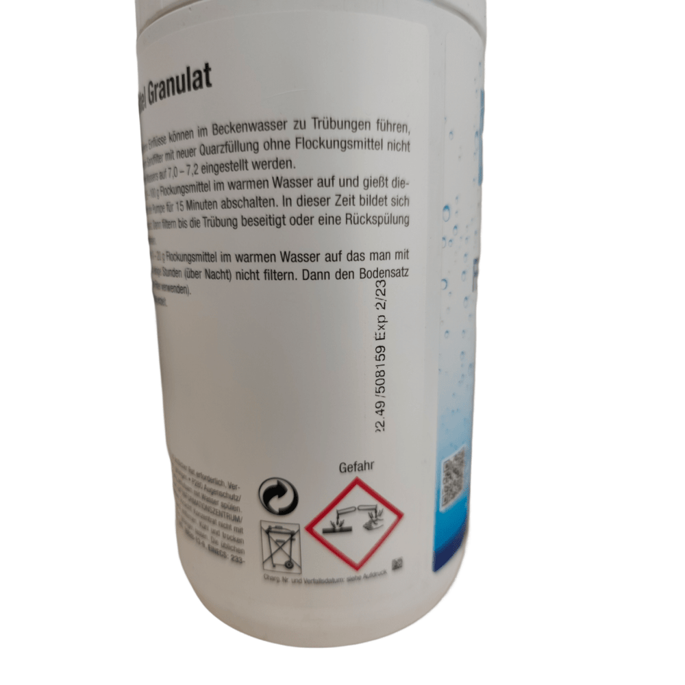 A major advantage of the flocculant is its high effectiveness in clarifying water. Rapid flocculation reliably removes both fine turbidity and larger dirt particles from the water, allowing for a quick return to swimming conditions.