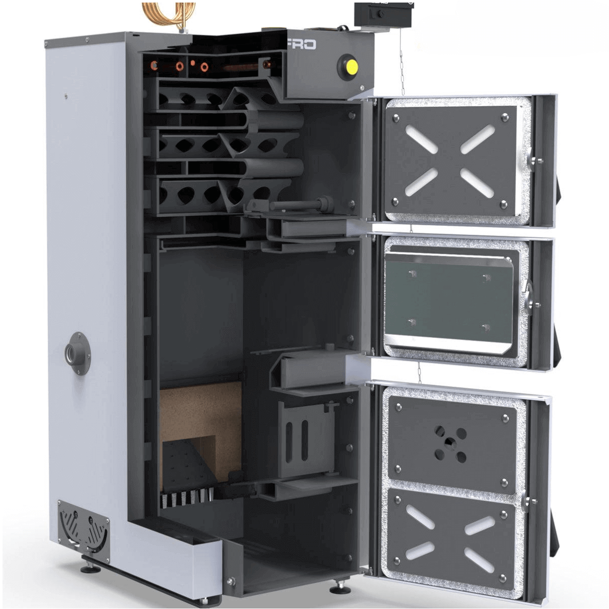 Le bois de chauffage Defro Plus Chaudière à tirage naturel de 15 kW Elle séduit par son corps de chaudière robuste et sa conception compacte. Un régulateur de fumée électronique intégré régule avec précision l'air de combustion, garantissant un fonctionnement économique et sûr. Sa conception innovante, avec échangeur de chaleur de sécurité et voyant intégrés en usine, permet également une surveillance visuelle aisée de la combustion.