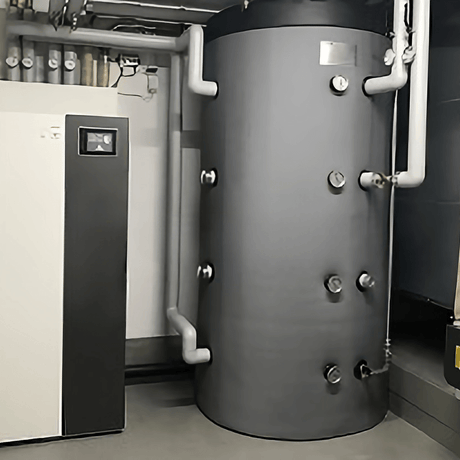 Ballon tampon d'énergie sans échangeur de chaleur pour systèmes de chauffage, solaires et à combustibles solides. Volume : 1 000 litres, isolation : 100 mm de mousse PU super rigide.