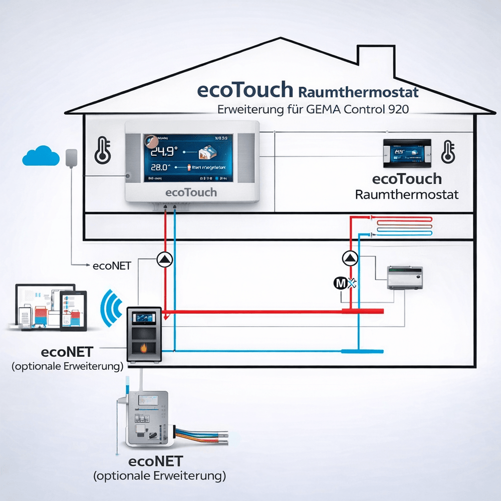 Le thermostat d'ambiance est connecté au GEMA Control 920 via le bus système et fonctionne simultanément comme capteur et unité de contrôle de température ambiante. Les valeurs de température mesurées sont transmises en continu au contrôleur et intégrées à la régulation.