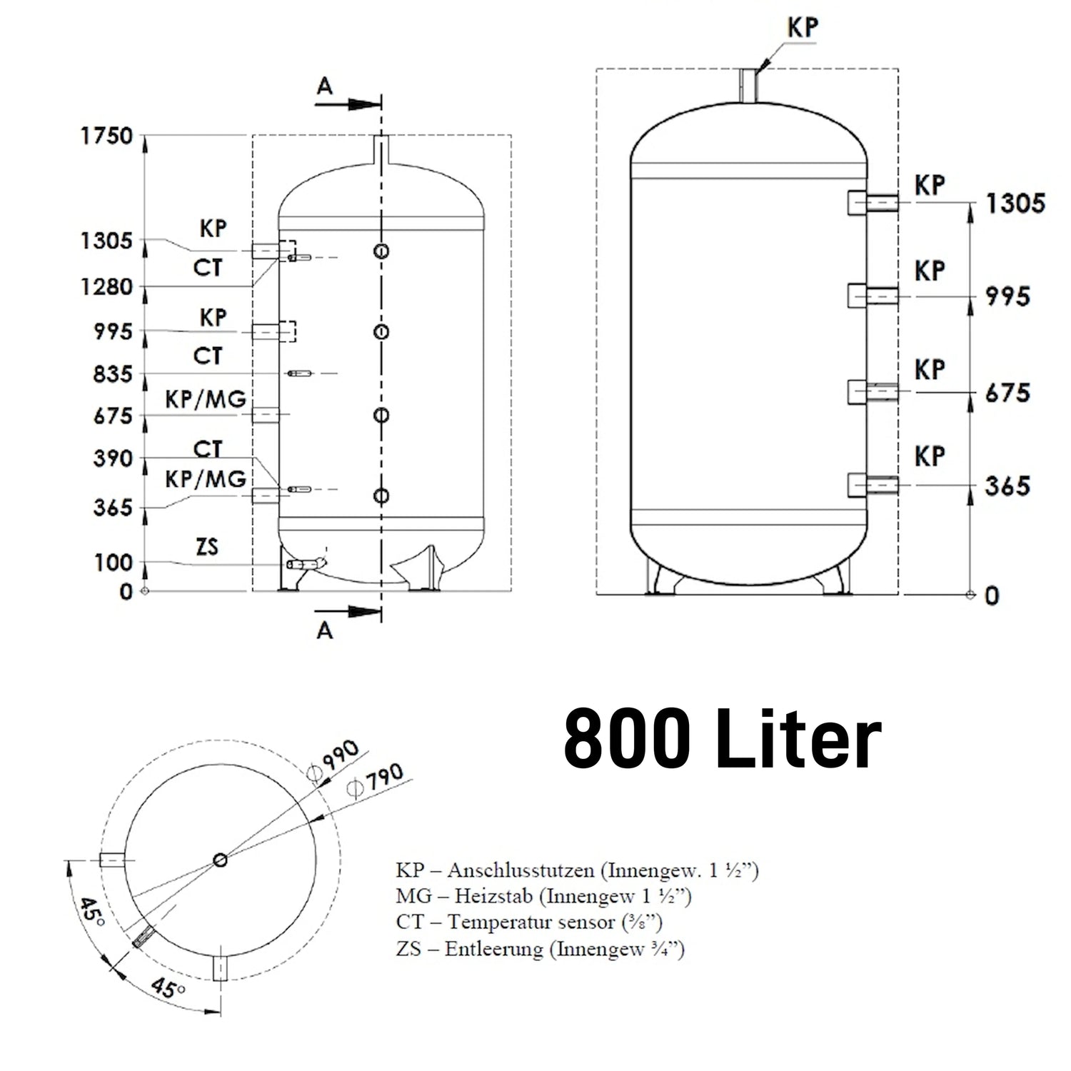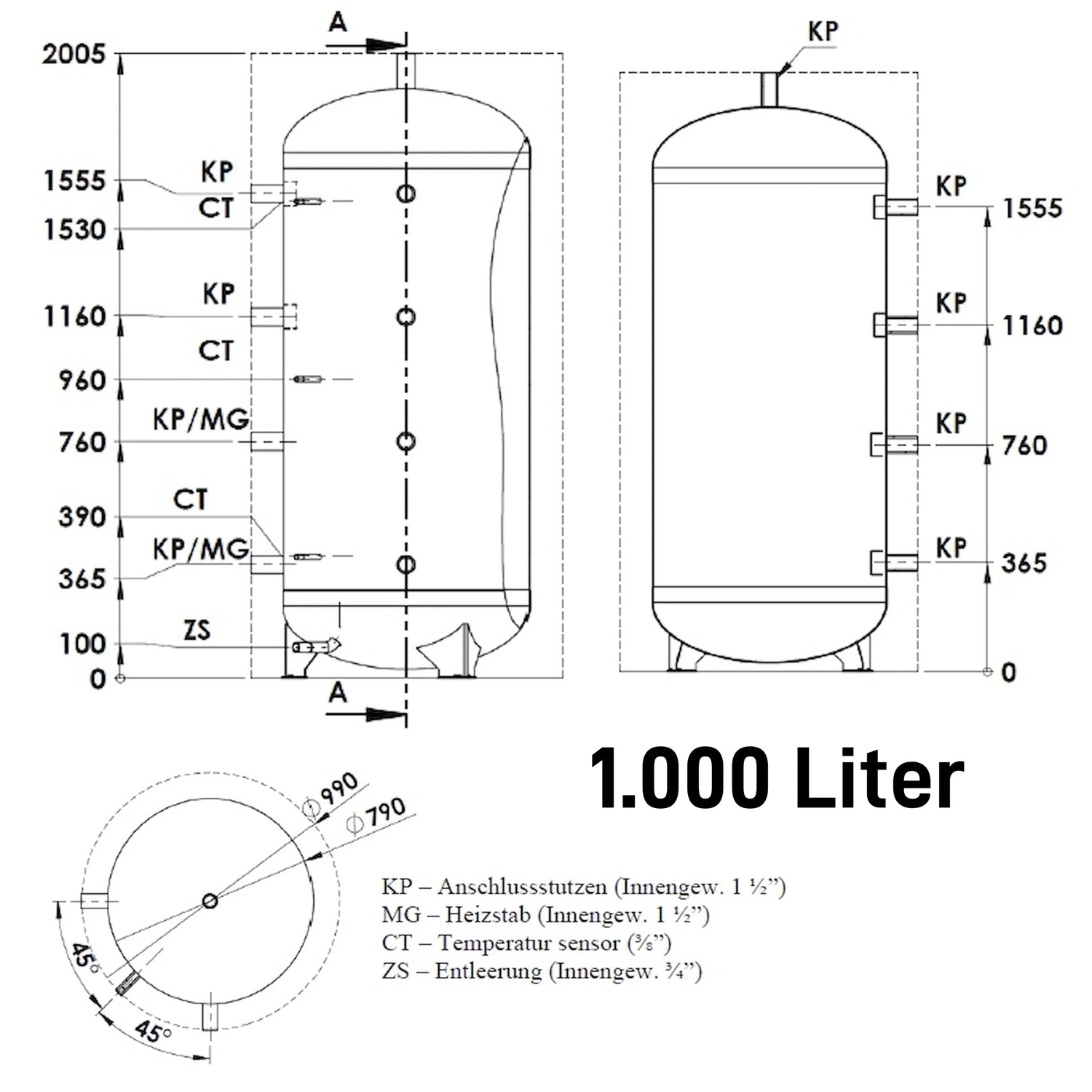 Dimenzije priključka: Priključak (KP) unutarnji navoj 1½", priključak grijača (MG) unutarnji navoj 1½", priključak temperaturnog senzora (CT) 3/8", Unutarnji navoj odvoda (ZS) 3/4".