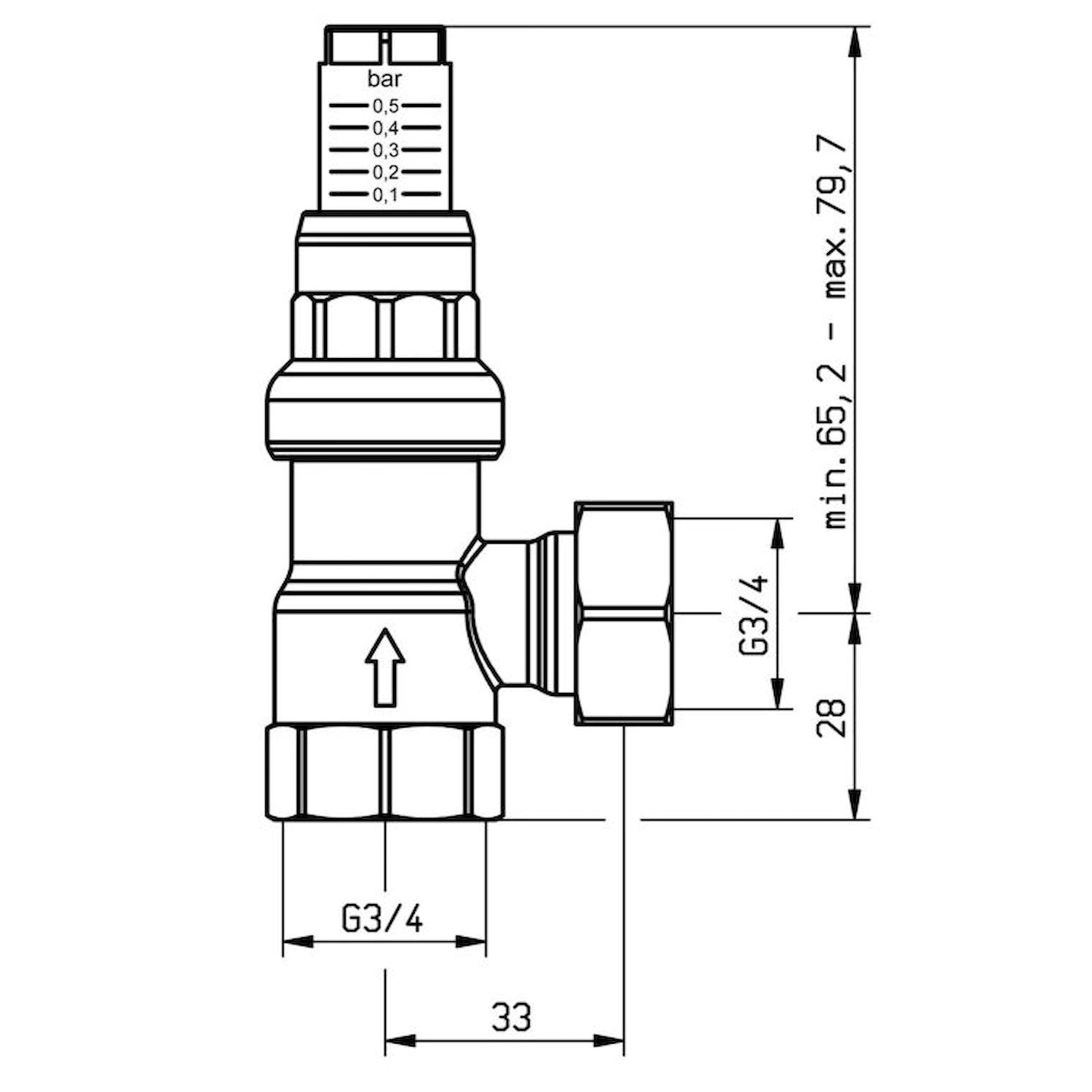 Raspon radne temperature: maks. 95 °C (kratkotrajno do 120 °C). Radni tlak: maks. 6 bara. Diferencijalni tlak kontinuirano podesiv: 0,1/0,5 bara. Materijal kućišta: mesing. Priključci: Ulaz unutarnji navoj G¾, izlaz plosnato brtveni vijčani spoj s navojnom maticom G¾.