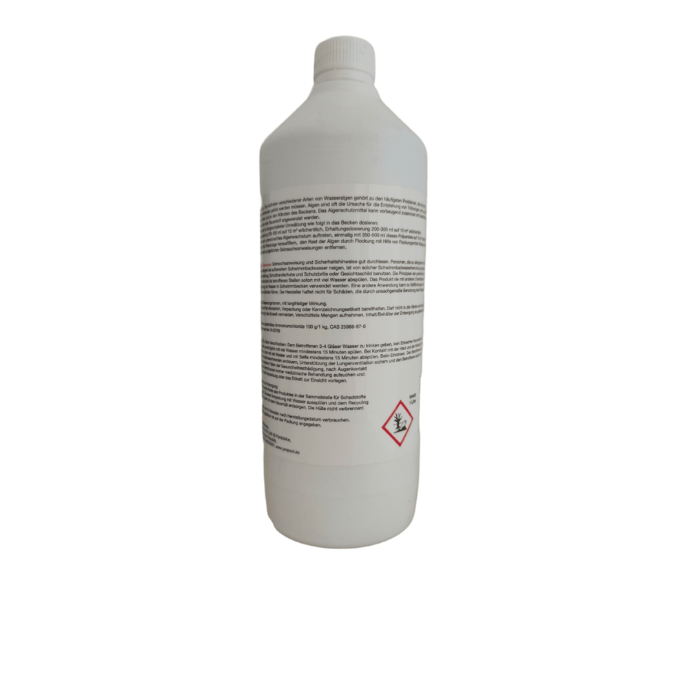 Naš 1-litrski izdelek za zatiranje alg je zasnovan za trajno vzdrževanje kakovosti vode v vašem bazenu. Učinkovito se bori proti različnim vrstam alg in preprečuje nenadzorovano množenje grdih in nadležnih alg. Ob ohranjanju nemotene plavalne izkušnje vaš bazen ostane prijeten.